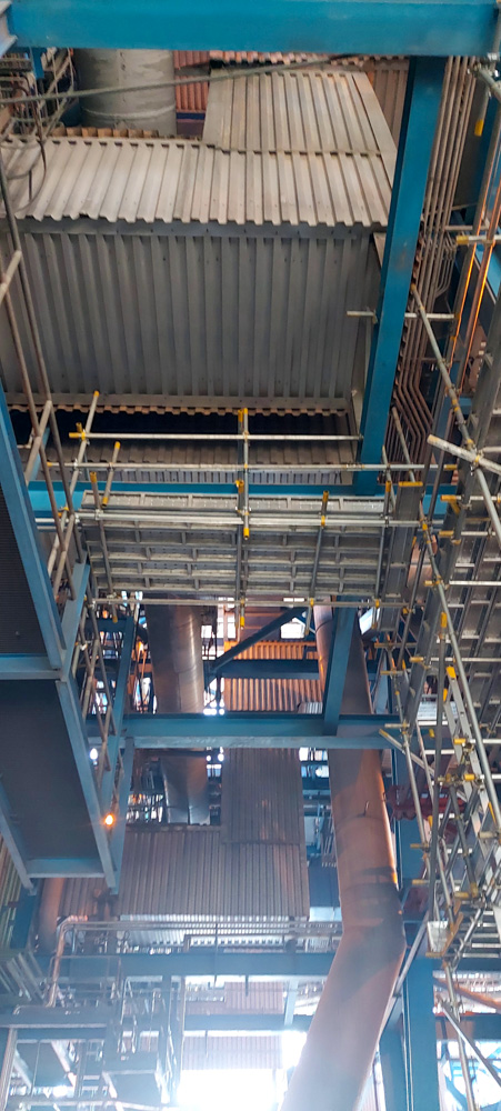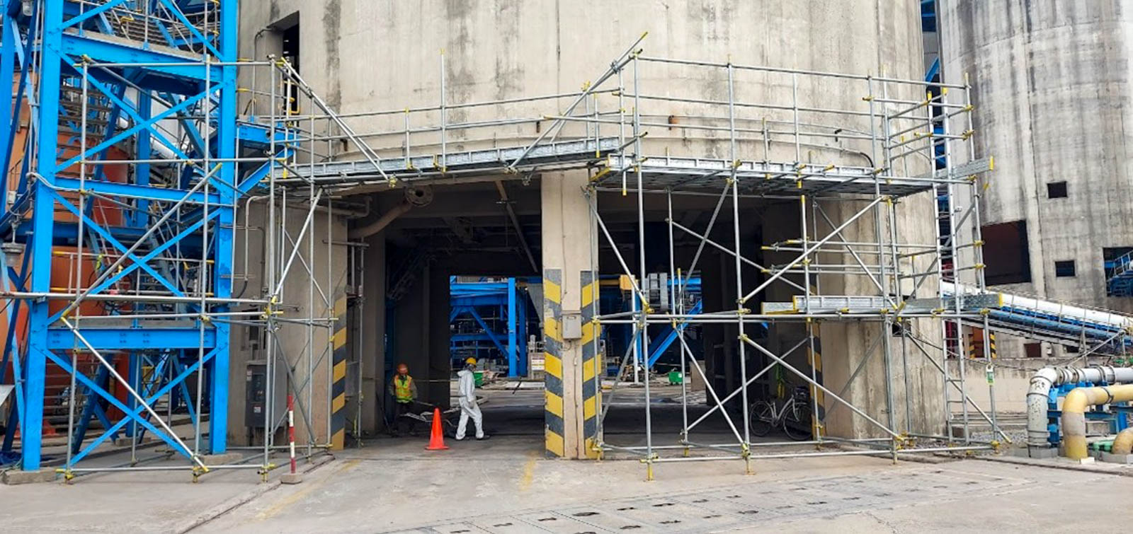 Điều này đòi hỏi đội ngũ thi công lắp dựng giàn giáo phải có năng lựcchuyên môn cao và thực hiện với độ chính xác tuyệt đối. Việc bố trí các trụ đứng phải đảm bảo khoảng hở kỹ thuật hợp lý - vừa đủ để phương tiện cơ giới ra vào an toàn, không va chạm với giàn giáo, vừa đáp ứng các yêu cầu thi công như lắp đặt hệ thống ống khí nén phía trên. Toàn bộ giải pháp kỹ thuật cần đảm bảo tính linh hoạt, an toàn và ổn định lâu dài trong điều kiện làm việc thực tế phức tạp.